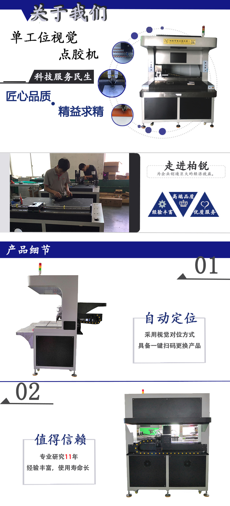 2、直接将产品放入料盘上滴胶,产品可任意摆放,360度全视觉定位。3、可以对产品进行打点、走直线、画圆弧、不规则曲线功能。连续打点300个点/秒,不漏滴、不错滴、不重复滴胶。