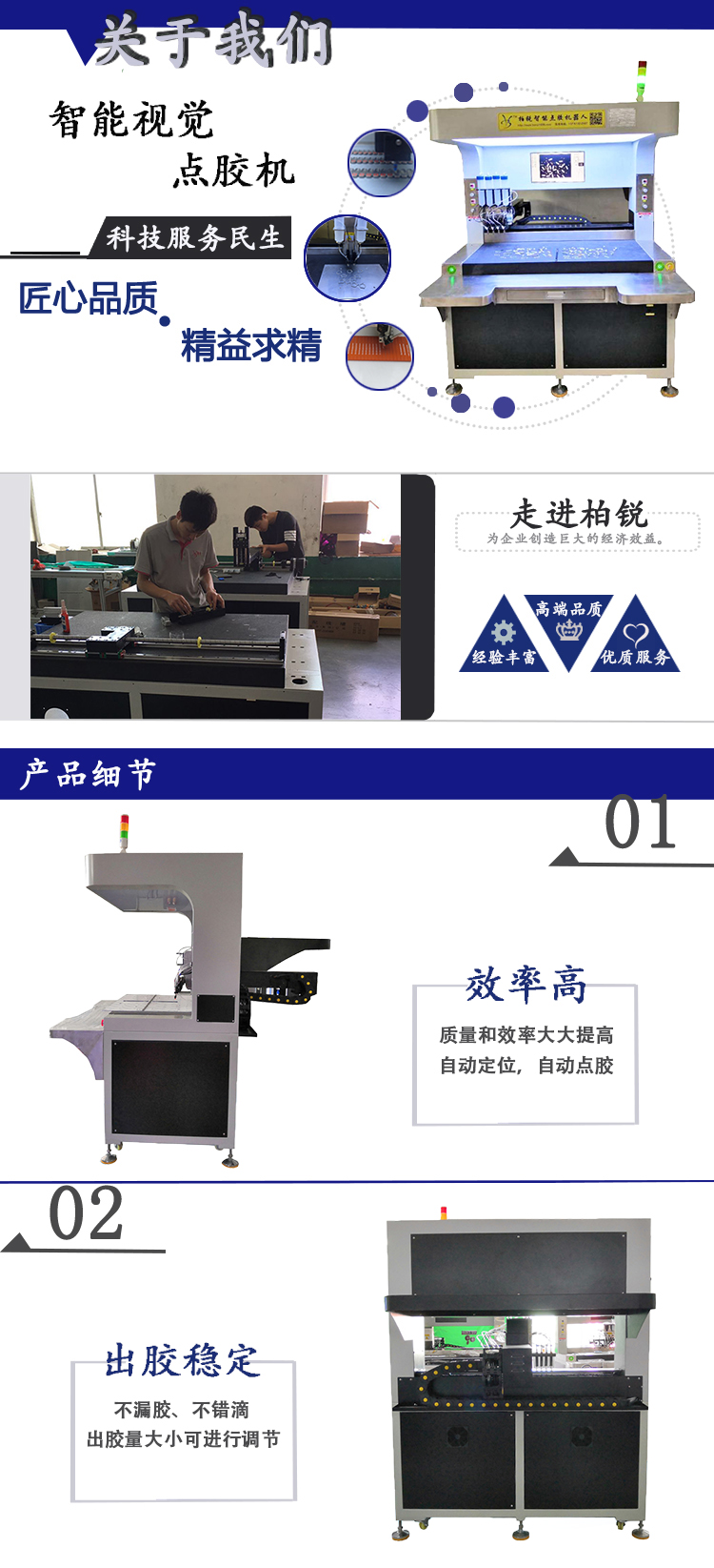 本公司自行研发全自动CCD视觉相机定位系统,配上自动跟踪定位相机,在运行过程中自动修正点胶坐标。直接将产品放入料盘上滴胶,产品可任意摆放,360度全视觉定位。可以打点、走直线、画圆弧、不规则曲线功能。连续打点30000个点/小时,不漏滴、不错滴、不重复滴。点胶精度高速度快:喷头离产品2- 6mm,不会碰伤到产品和模具,无需要人工补胶,生产出的产品表面非常干净。可双工位多色滴胶抹油,左、右各放置一个料盘,当左边滴胶头开始工作,右相机开始拍照呈机,左、右交替拍照,机器不停机的工作.不用人工排列,将产品放在机器工作台面。方便 快捷 省时 省人真正为企业实现制程自动化,节省人力、物力、提高产能及良品率。产配置
