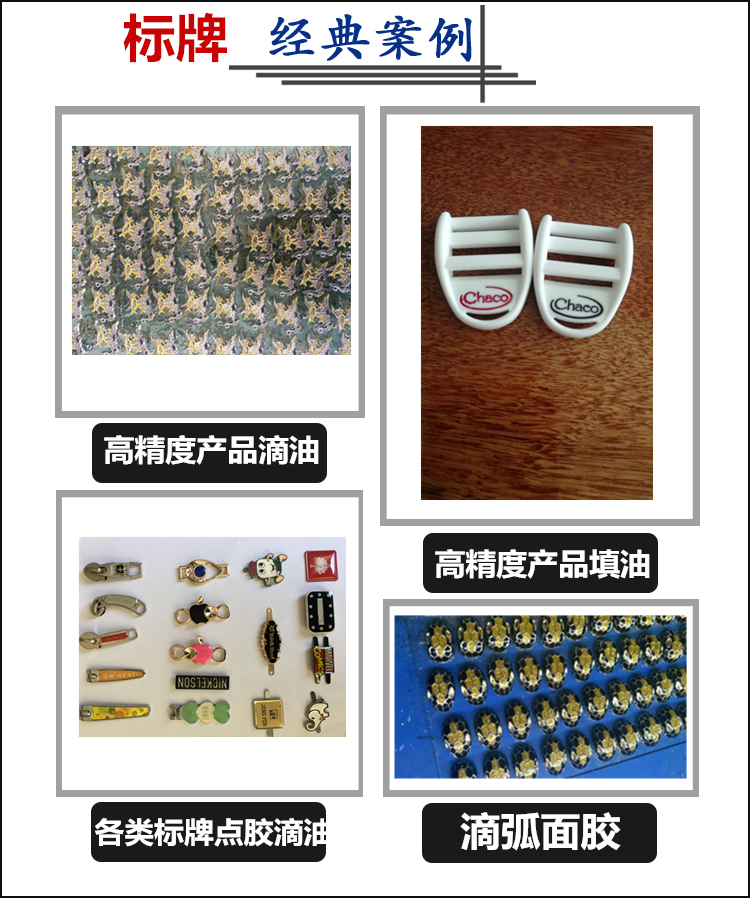 8、适用于产品:LED各类点胶、COB点胶、各类五金件滴胶、服装辅料滴胶、鞋材PU滴胶商标滴胶、工艺礼品、箱包水晶滴胶、微章油漆点胶、PVC商标点胶、矽胶胶章等滴胶产品均可用视觉定位机器滴胶。