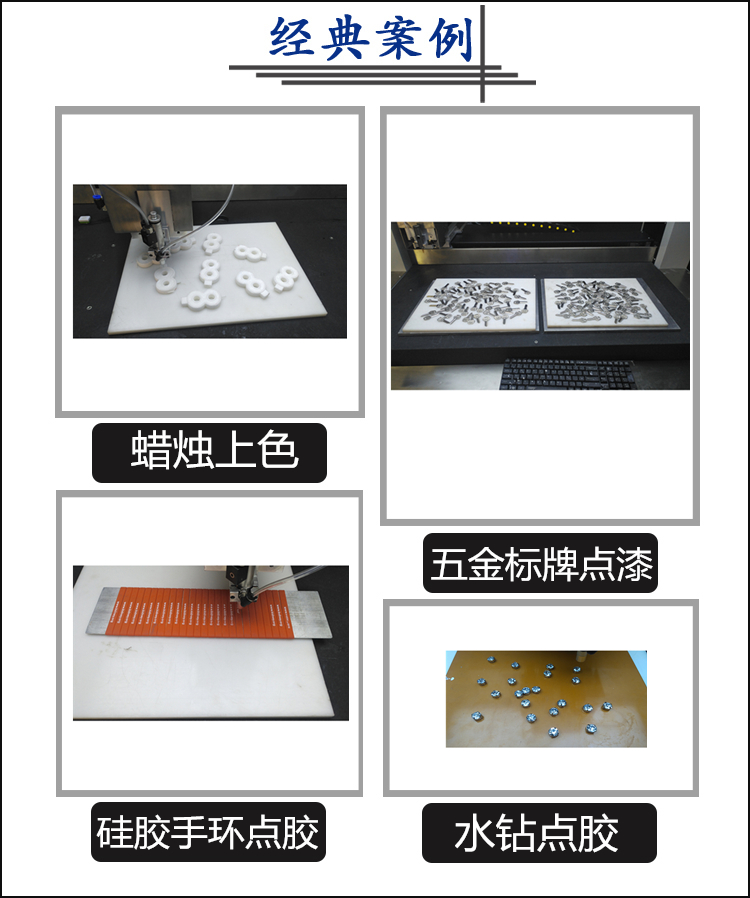 本公司自行研发全自动CCD视觉点胶机相机定位系统,配上自动精确跟踪定位相机,在运行过程中自动修正点胶坐标。直接将产品放入料盘上滴胶,产品可任意摆放,360度全视觉定位。可以打点、走直线、画圆弧、不规则曲线功能。连续打点30000个点/小时,不漏滴、不错滴、不重复滴。点胶精度高速度快:喷头离产品2- 6mm,不会碰伤到产品和模具,无需要人工补胶,生产出的产品表面非常干净。可双工位多色滴胶抹油,左、右各放置一个料盘,当左边滴胶头开始工作,右相机开始拍照呈机,左、右交替拍照,机器不停机的工作.不用人工排列,将产品放在机器工作台面。方便 快捷 省时 省人真正为企业实现制程自动化,节省人力、物力、提高产能及良品率。