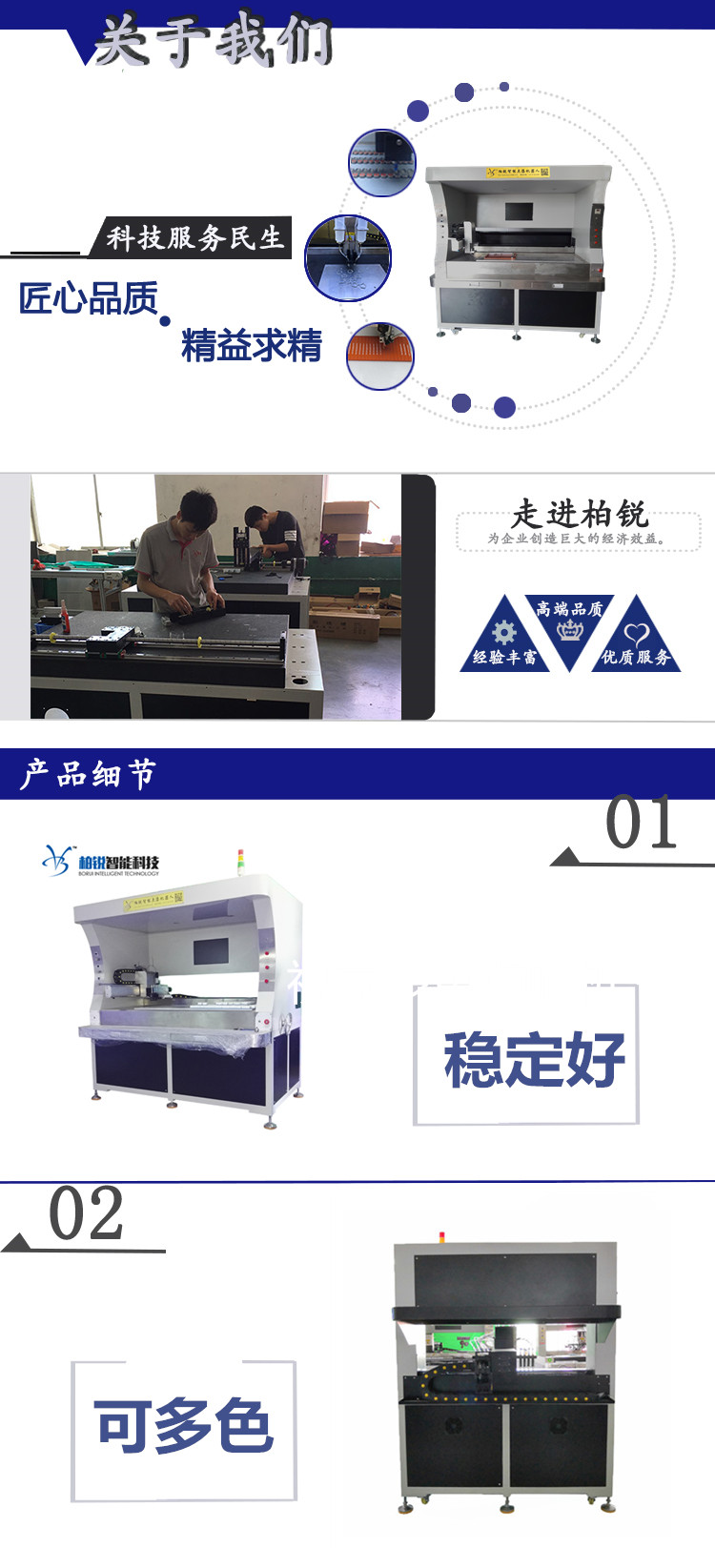 可视化点胶机即为:电脑自动识别被点胶产品形状大小、点胶部位再进行人工智能智能分析得出整个做工过程后进行做工的一套智能点胶机器人。